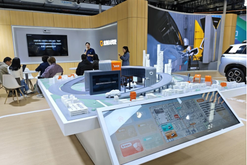 在滴滴自动驾驶展台,智能沙盘展示全无人Robotaxi运营场景。
